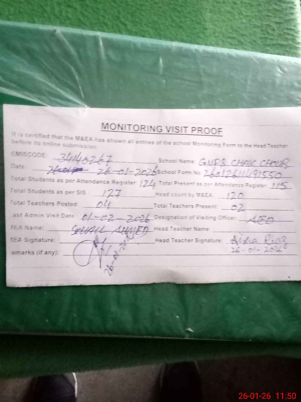 | Attendance Register | Head Teacher | MEA with School | Visit Proof |