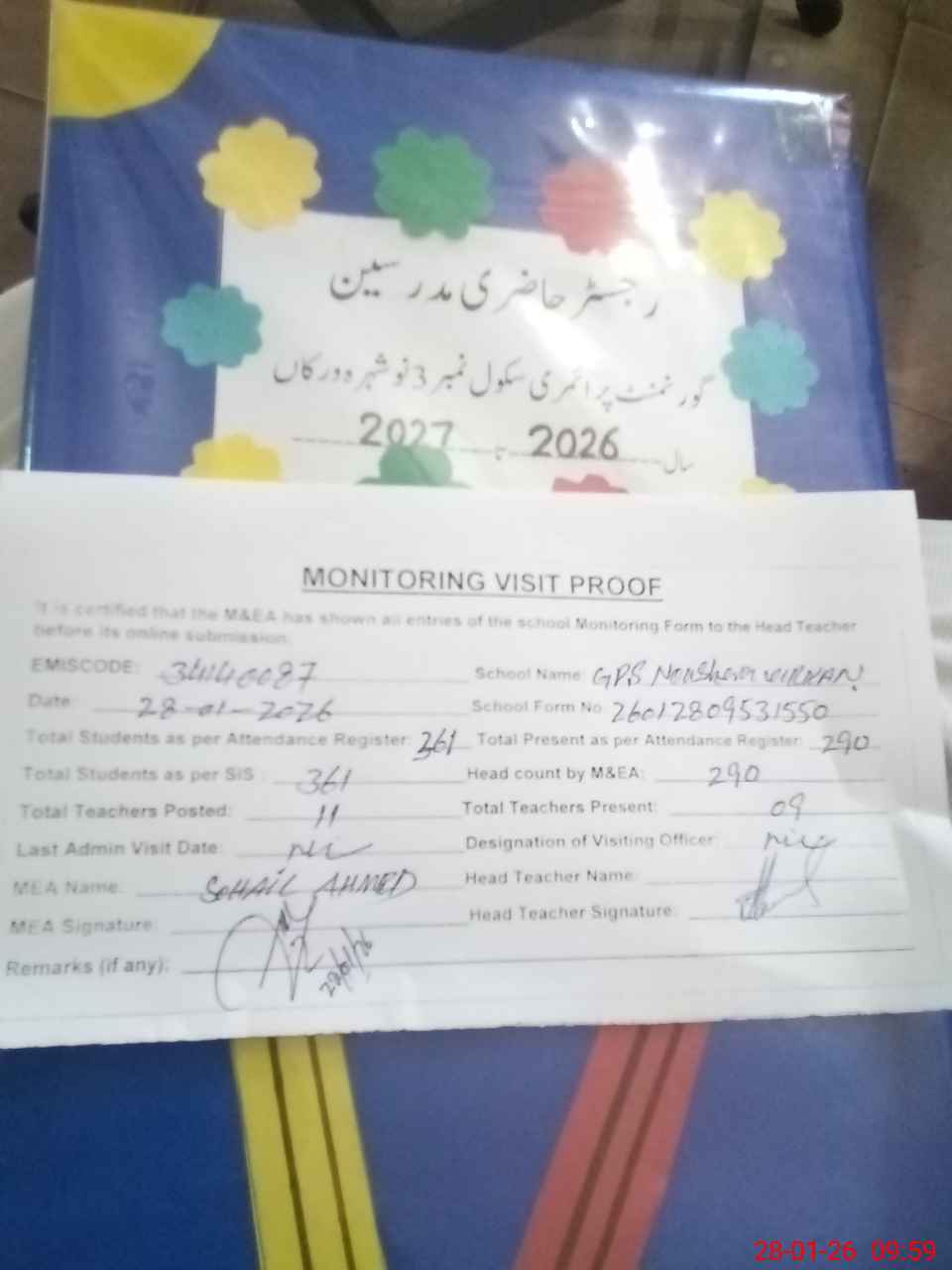 | Attendance Register | Head Teacher | MEA with School | Visit Proof |