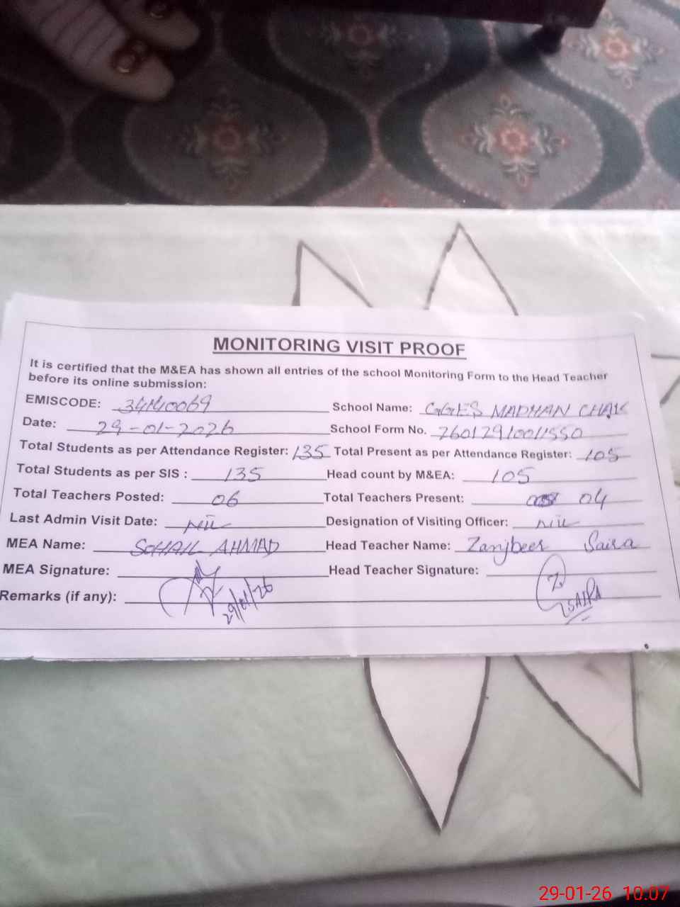 | Attendance Register | Head Teacher | MEA with School | Visit Proof |