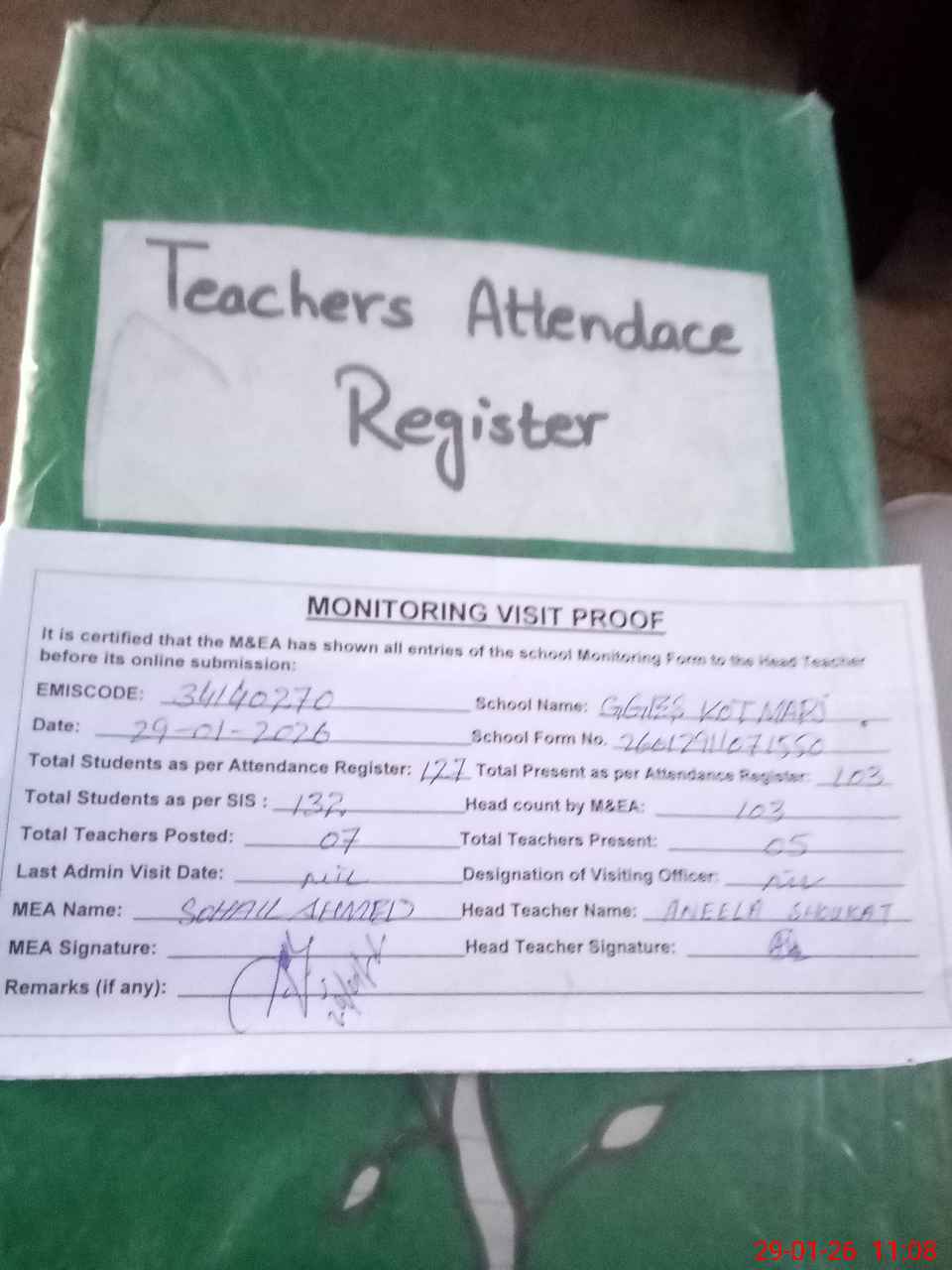 | Attendance Register | Head Teacher | MEA with School | Visit Proof |