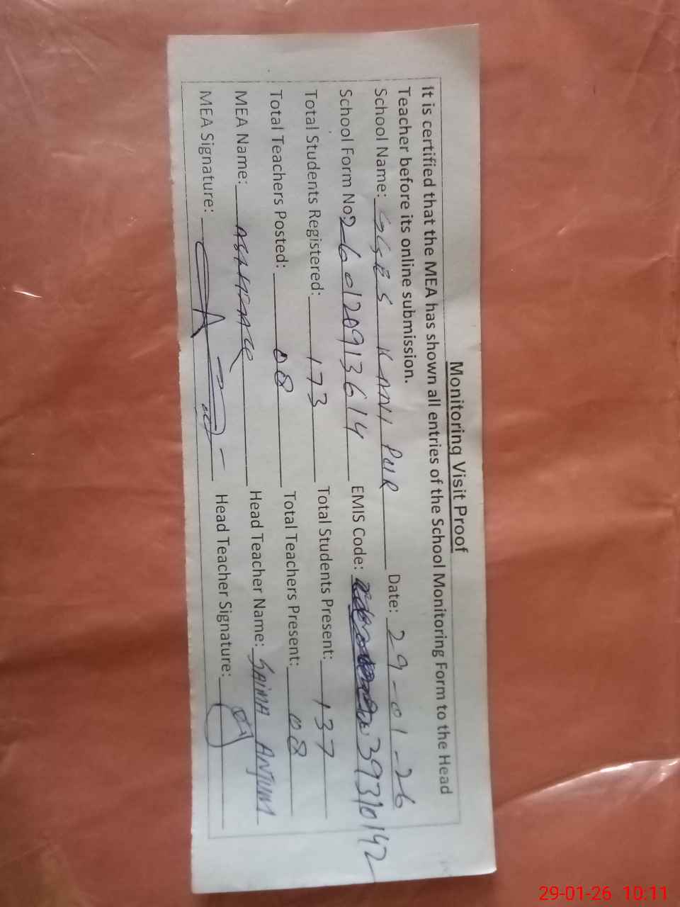 | Attendance Register | Head Teacher | MEA with School | Visit Proof |