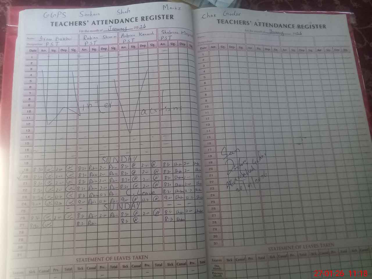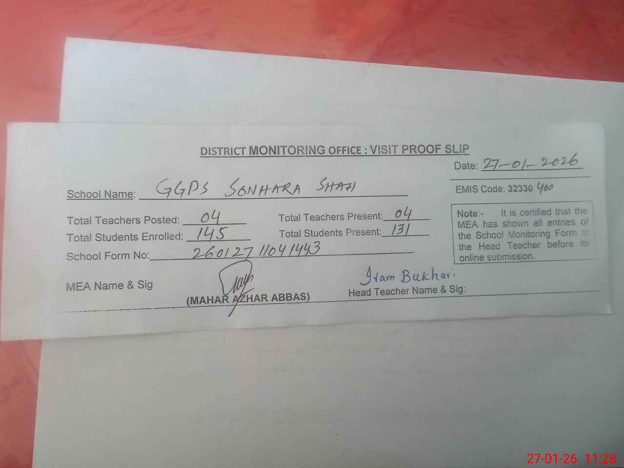 | Attendance Register | Head Teacher | MEA with School | Visit Proof |