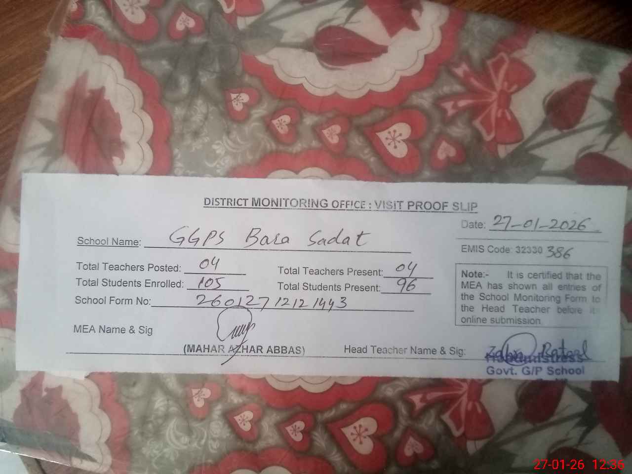 | EMIS Code: 32330386 | Name of School: GGPS BARA SADAT | |||