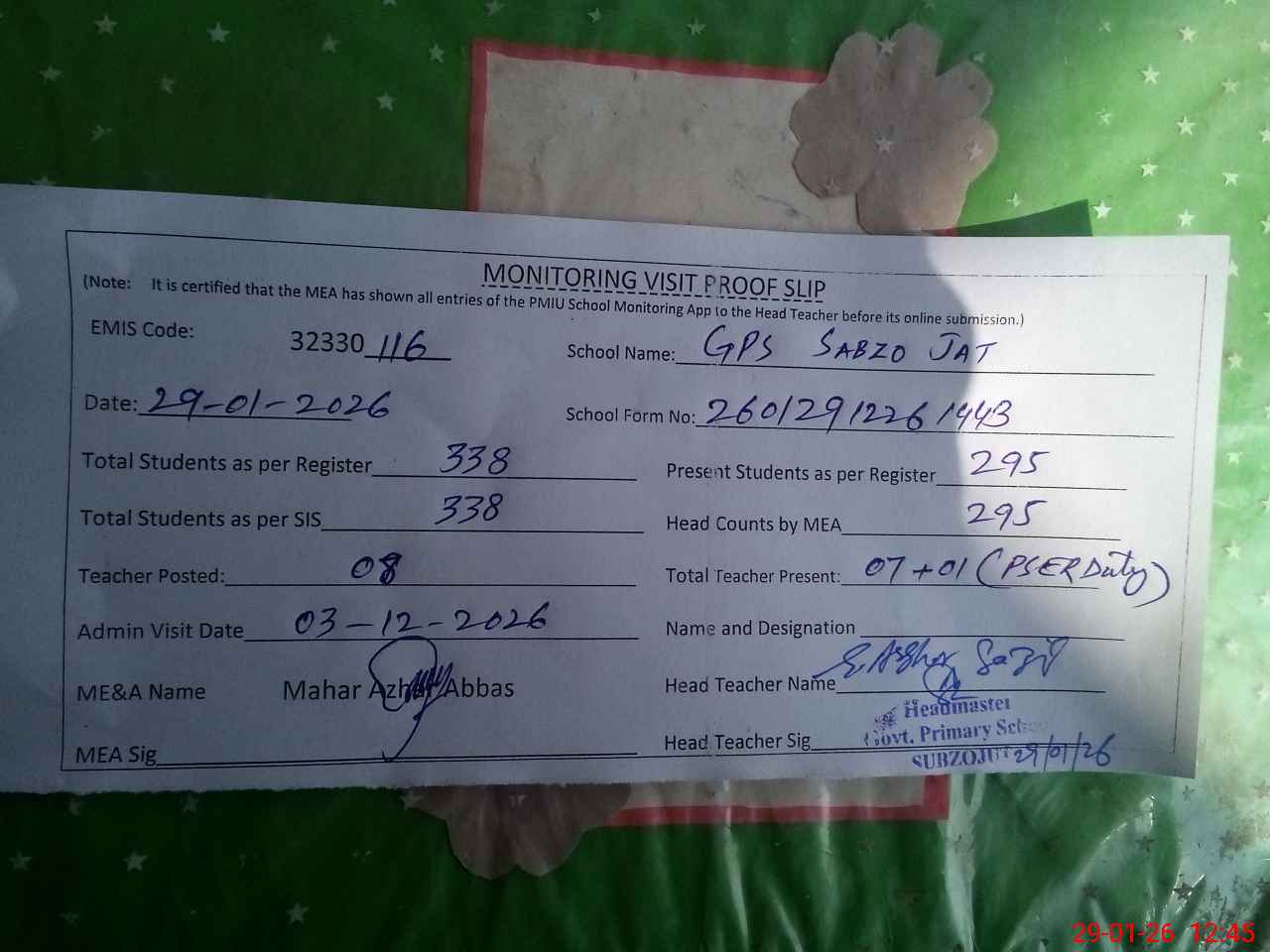 | EMIS Code: 32330116 | Name of School: GPS SABZO JAT | |||
