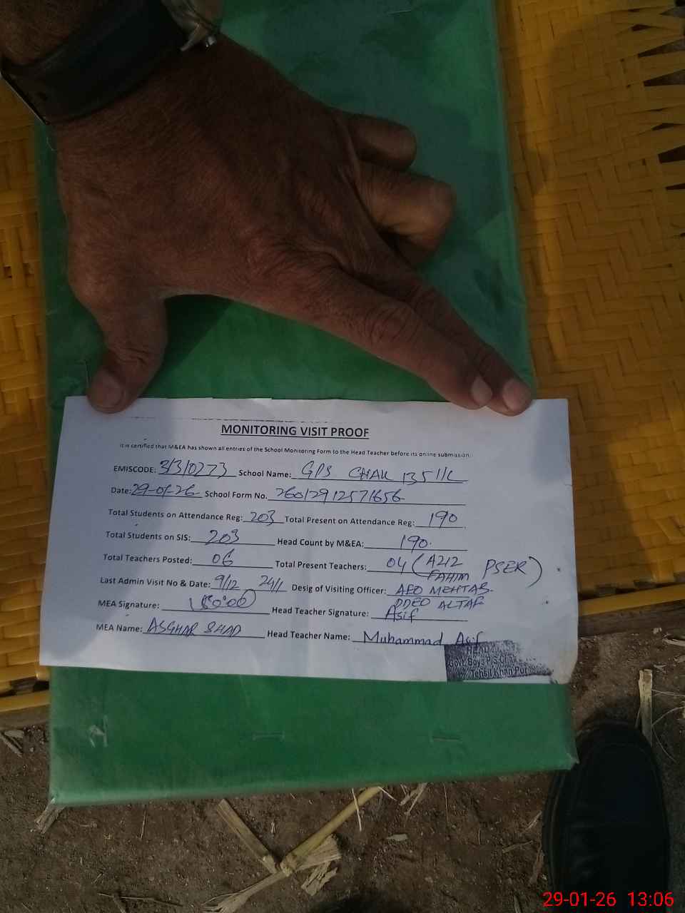 | Attendance Register | Head Teacher | MEA with School | Visit Proof |