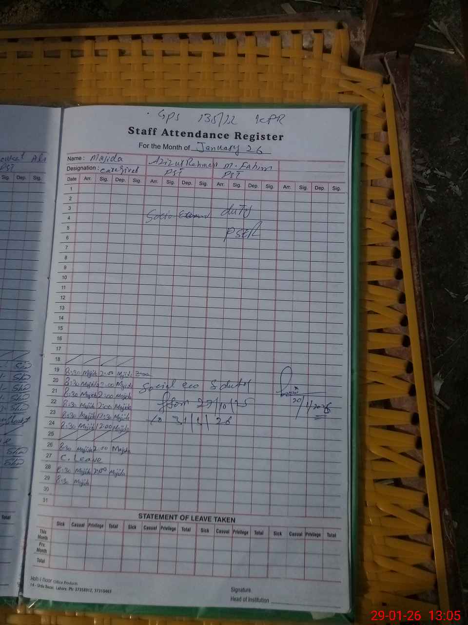 | Leave | Duty | Absent | Maternity | Medical | Ex- Pak |
