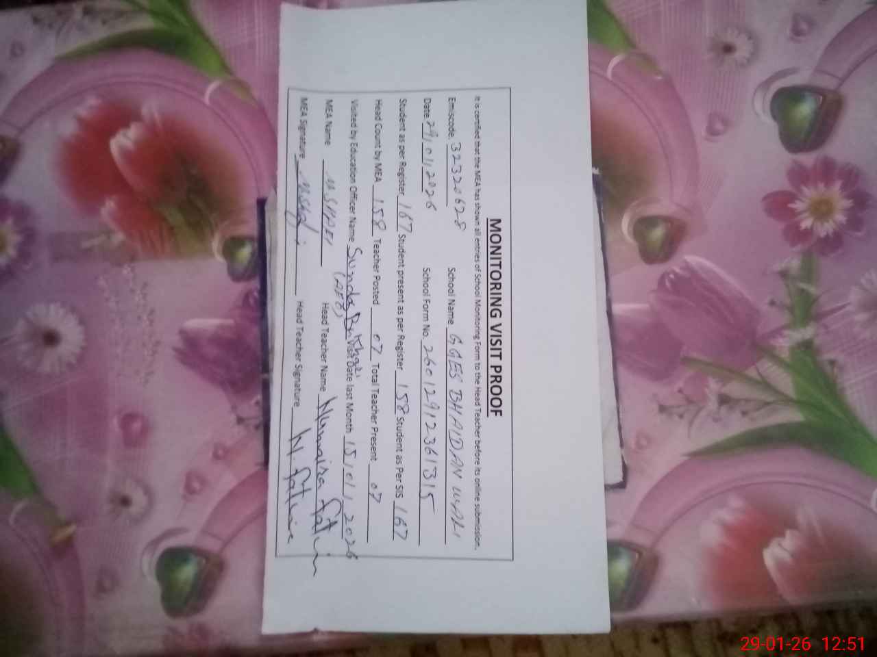 | Attendance Register | Head Teacher | MEA with School | Visit Proof |