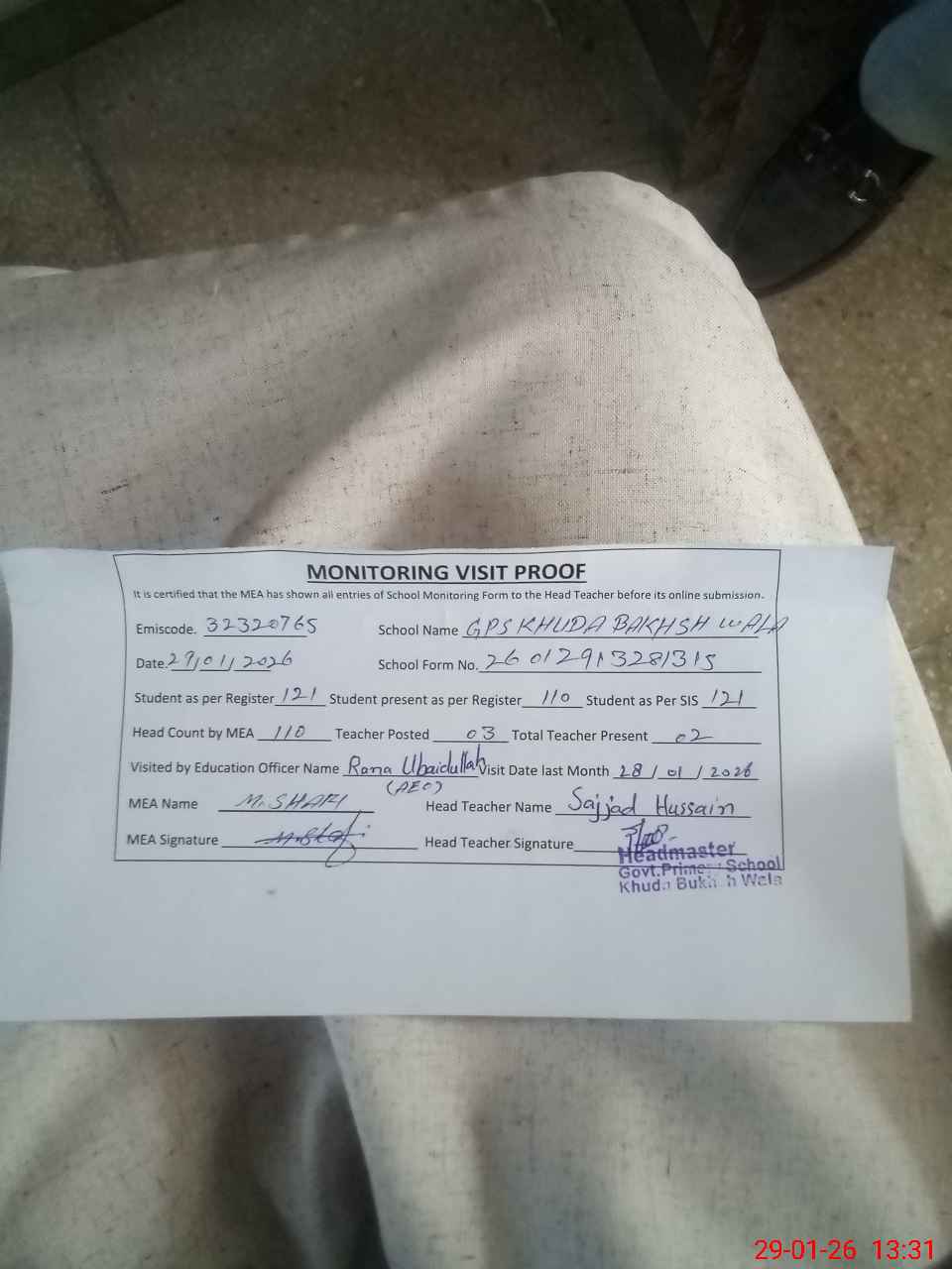 | EMIS Code: 32320765 | Name of School: GPS KHUDA BAKHSH WALA | |||