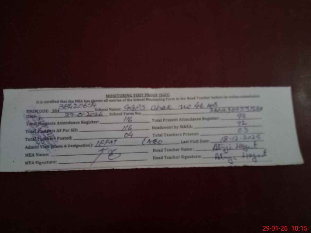 | Attendance Register | Head Teacher | MEA with School | Visit Proof |
