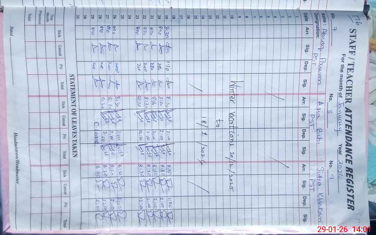 | Attendance Register | Head Teacher | MEA with School | Visit Proof |