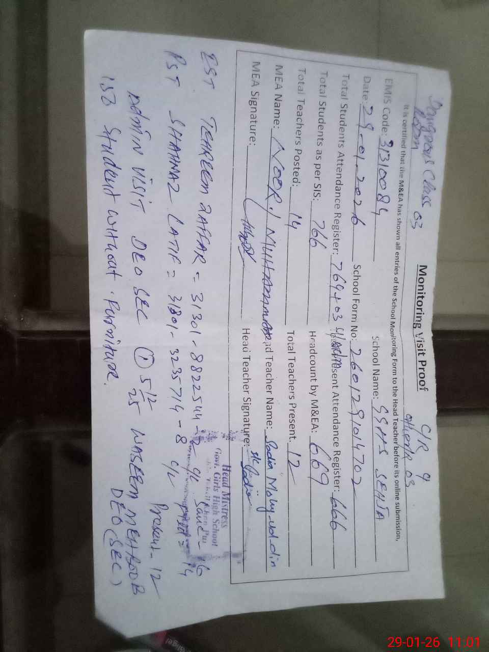 | Attendance Register | Head Teacher | MEA with School | Visit Proof |