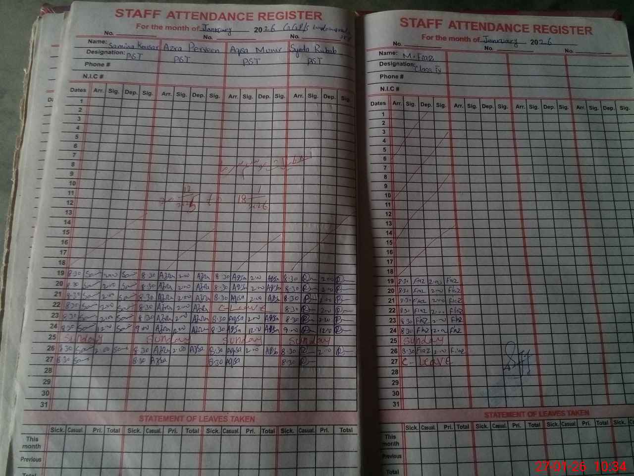 | CNIC | Full Name | Designation | R/C | Absence During Last Calender Month |