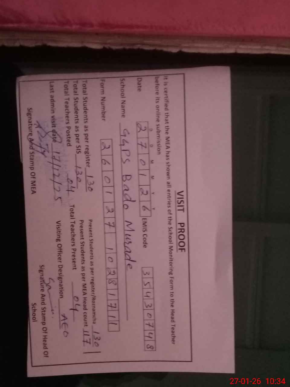 | Attendance Register | Head Teacher | MEA with School | Visit Proof |