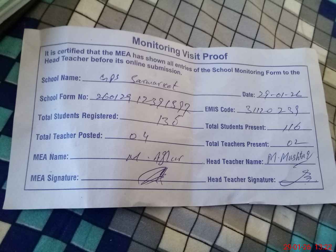 | Attendance Register | Head Teacher | MEA with School | Visit Proof |