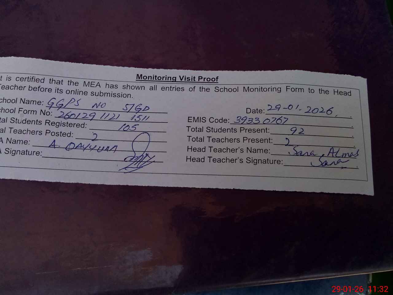 | Attendance Register | Head Teacher | MEA with School | Visit Proof |