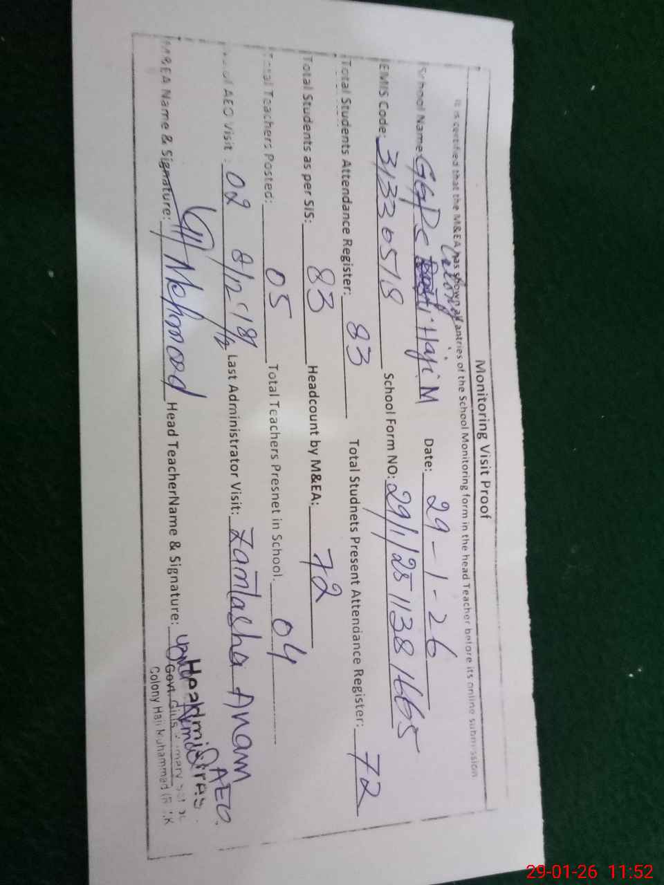 | Attendance Register | Head Teacher | MEA with School | Visit Proof |