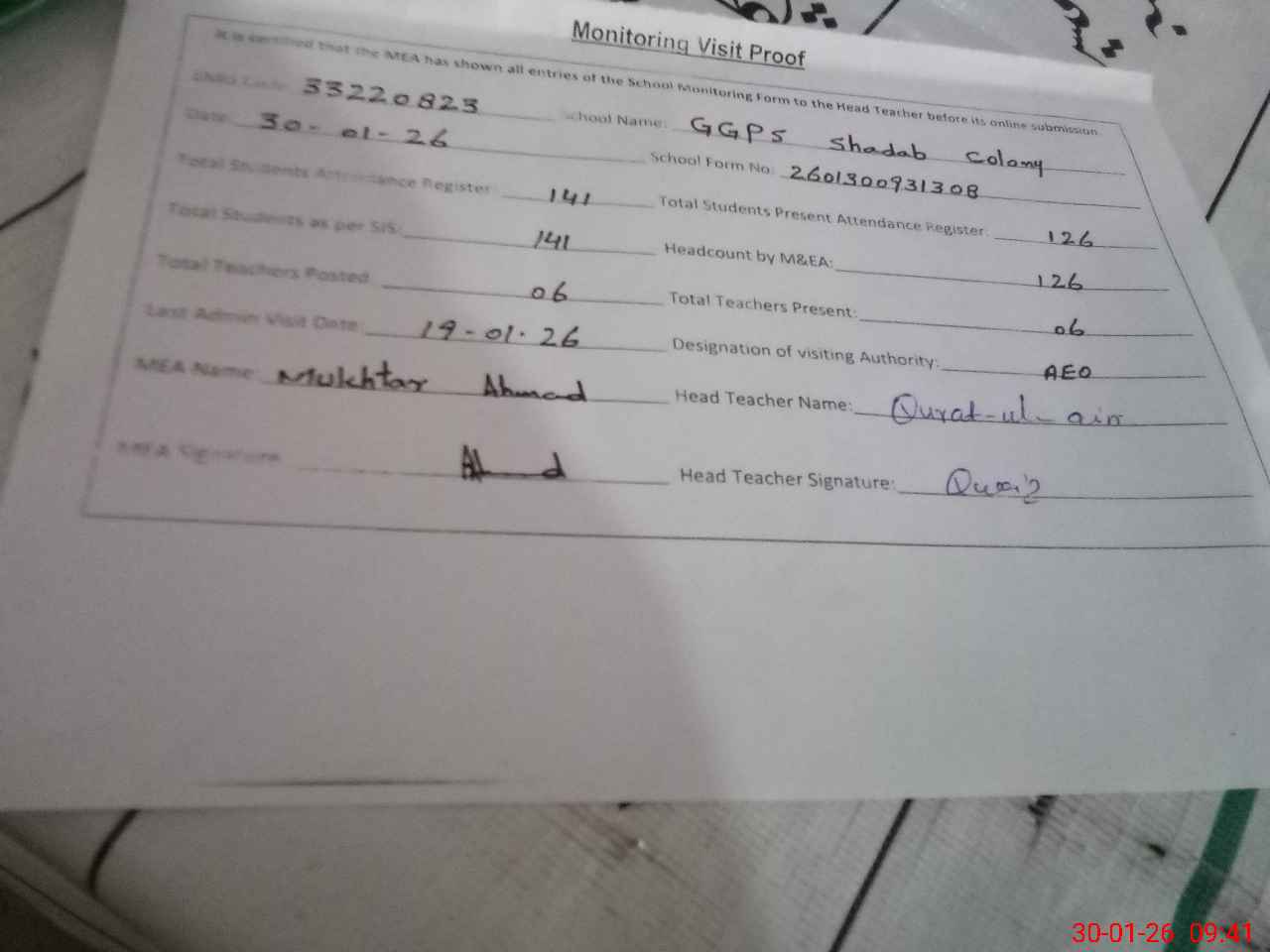 | Attendance Register | Head Teacher | MEA with School | Visit Proof |