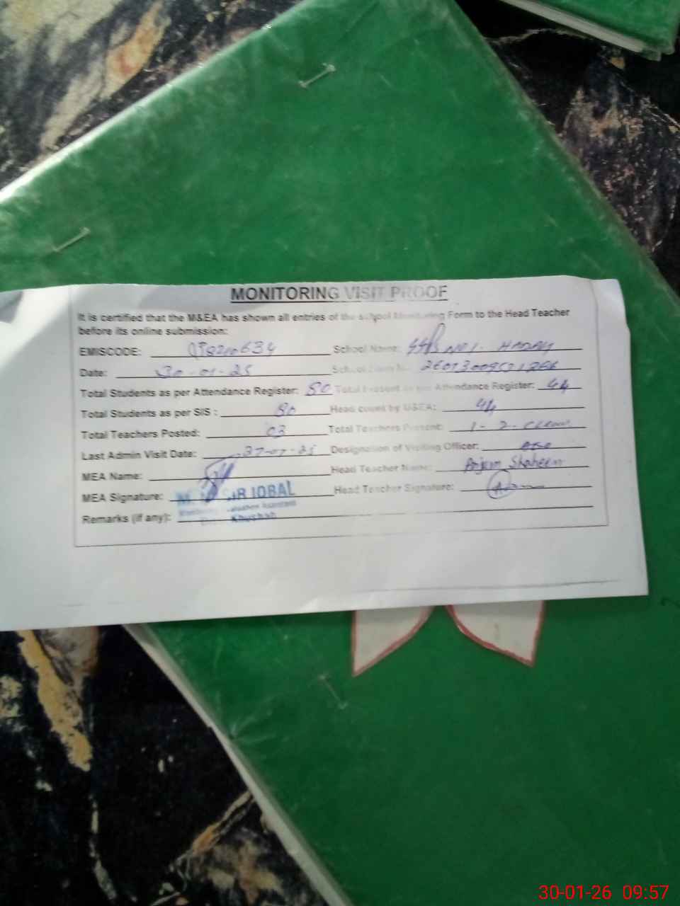 | Attendance Register | Head Teacher | MEA with School | Visit Proof |