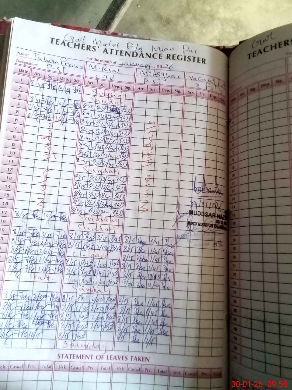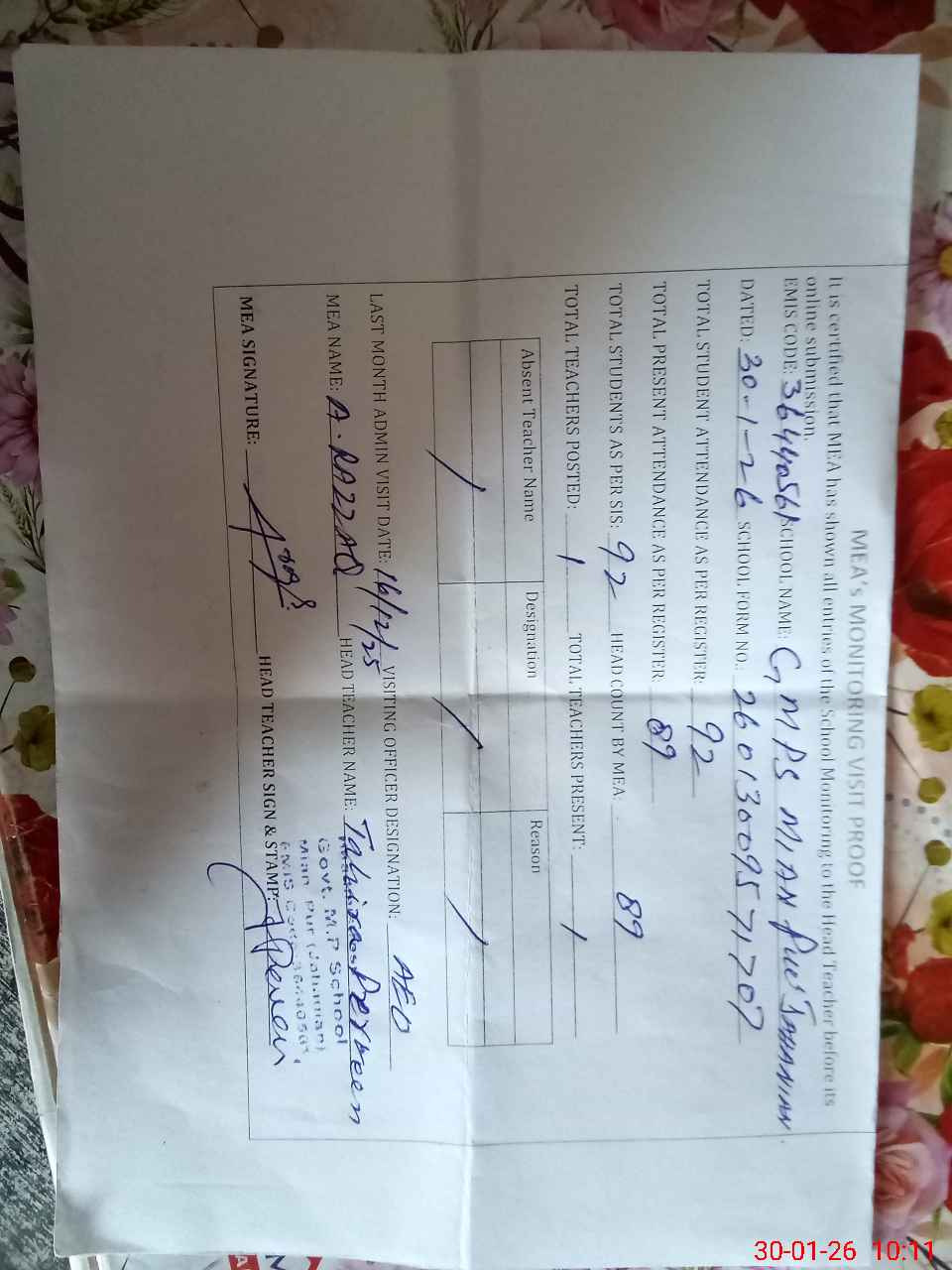 | Attendance Register | Head Teacher | MEA with School | Visit Proof |