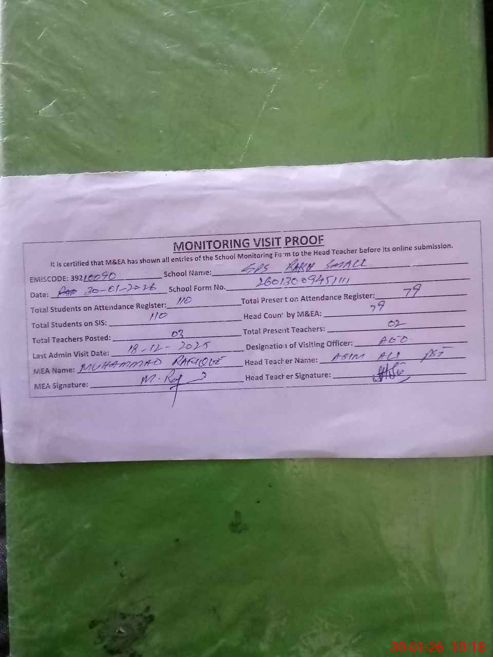 | Attendance Register | Head Teacher | MEA with School | Visit Proof |