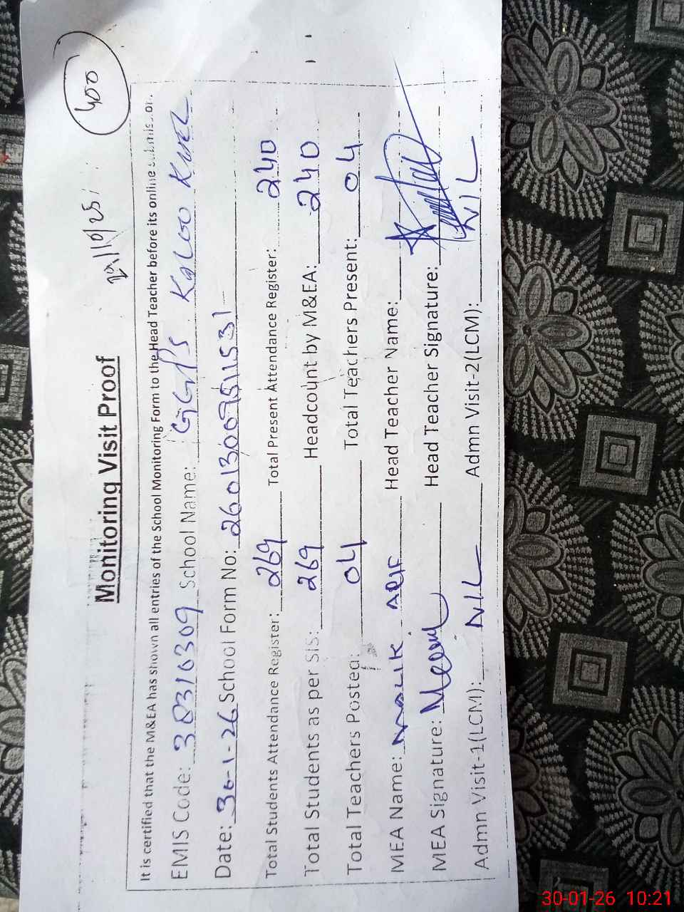 | Attendance Register | Head Teacher | MEA with School | Visit Proof |