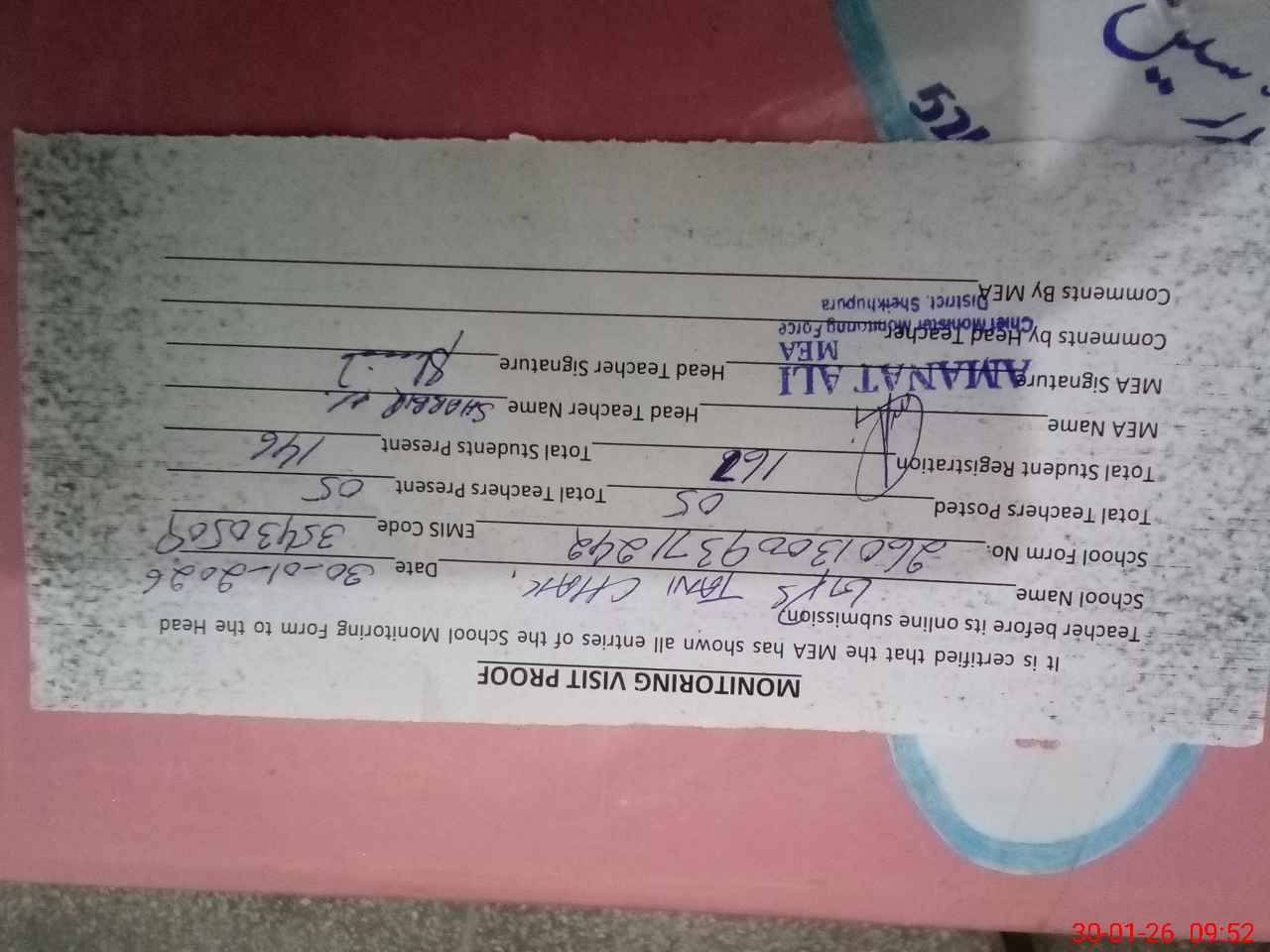 | Certified that this School was Inspected by the Undersigned MEA/DMO Today and the Information Stated Above is as Per Record. | |||||