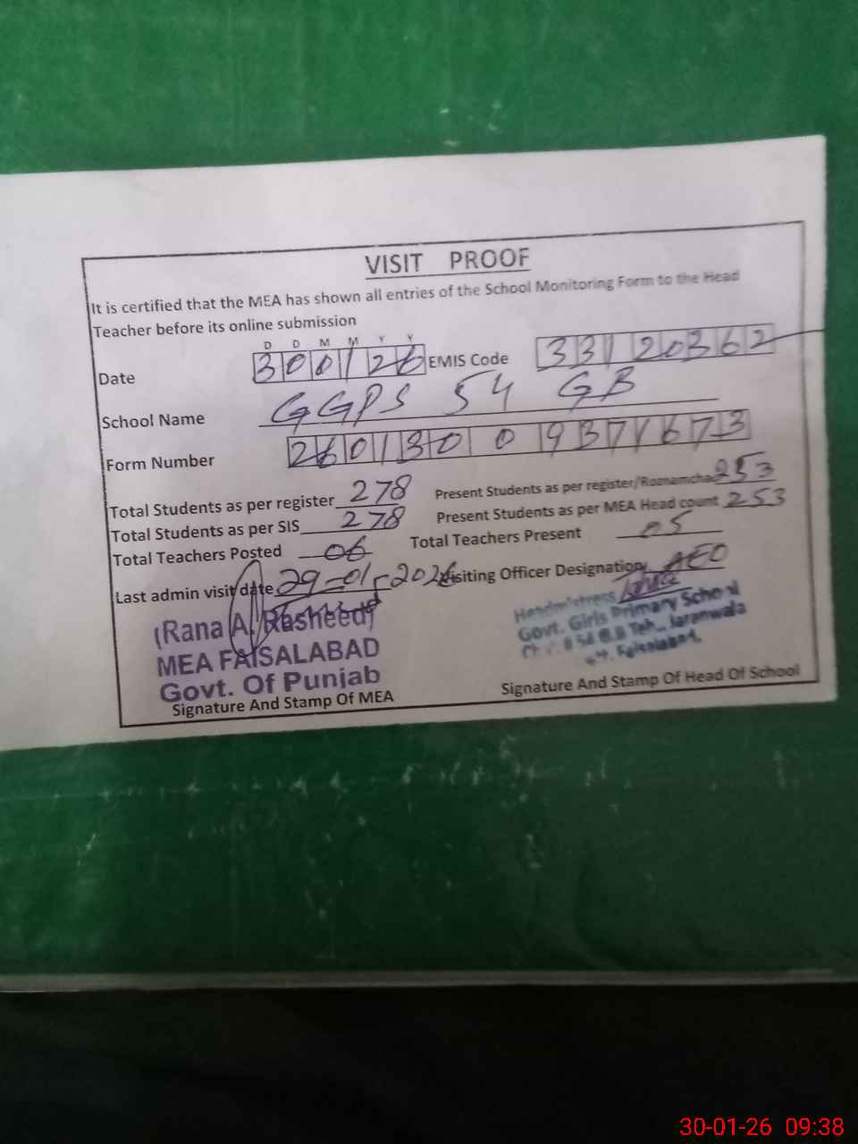 | Attendance Register | Head Teacher | MEA with School | Visit Proof |
