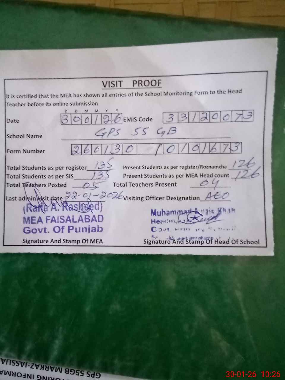 | Attendance Register | Head Teacher | MEA with School | Visit Proof |