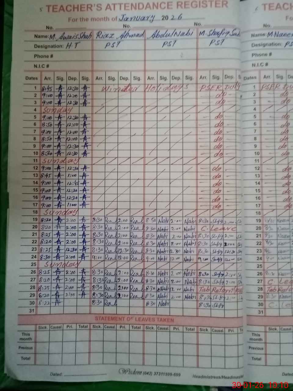 | CNIC | Full Name | Designation | R/C | Absence During Last Calender Month |