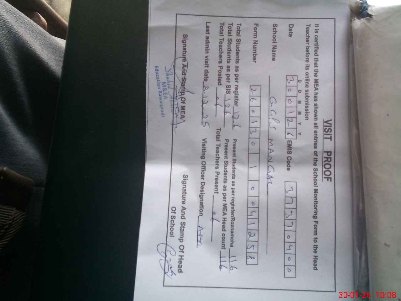 | Attendance Register | Head Teacher | MEA with School | Visit Proof |