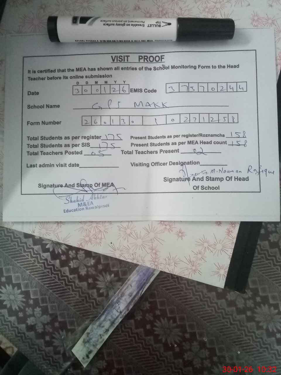 | Attendance Register | Head Teacher | MEA with School | Visit Proof |