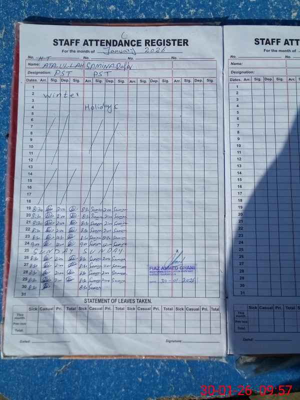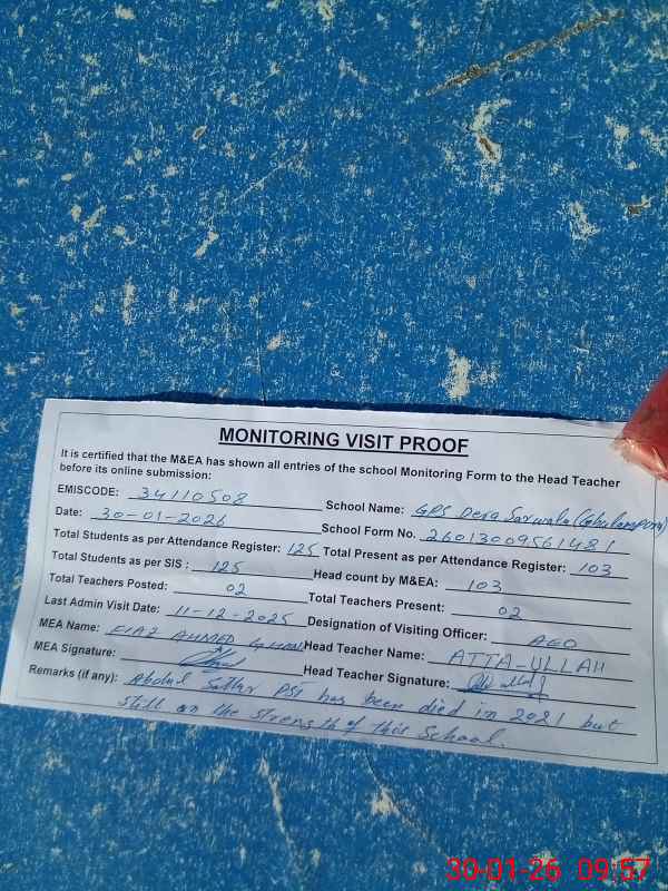 | Remarks (Use Separate Page if Required): Attendance of teaching staff and students on SIS Software is updated NSB Record Register is not updated at the time of visit Abdul Sattar PST has been died in 2021 but yet not removed from the posted strength of this School Data as per provided by School Staff and found during physical visit | |||||
