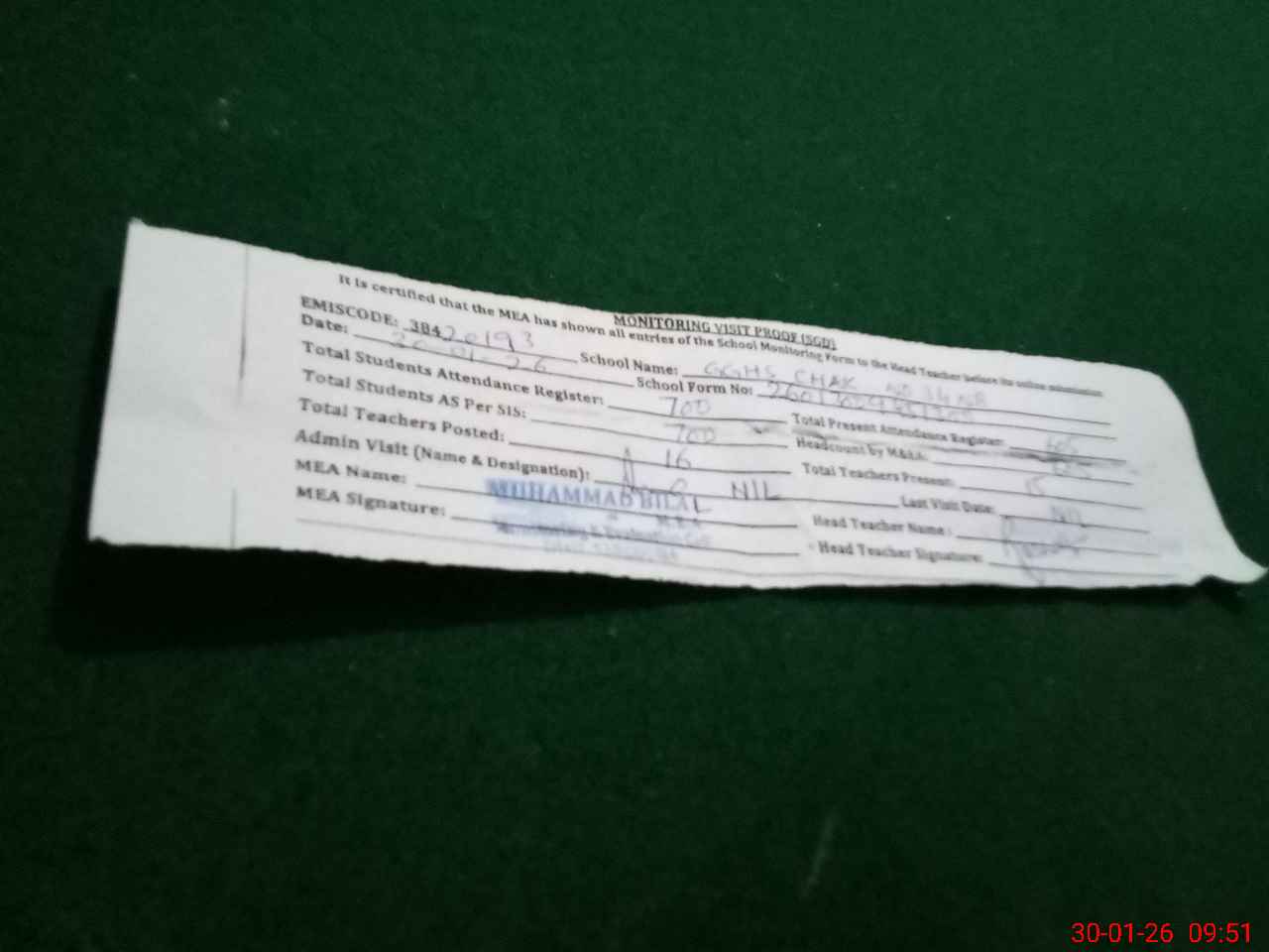 | Attendance Register | Head Teacher | MEA with School | Visit Proof |