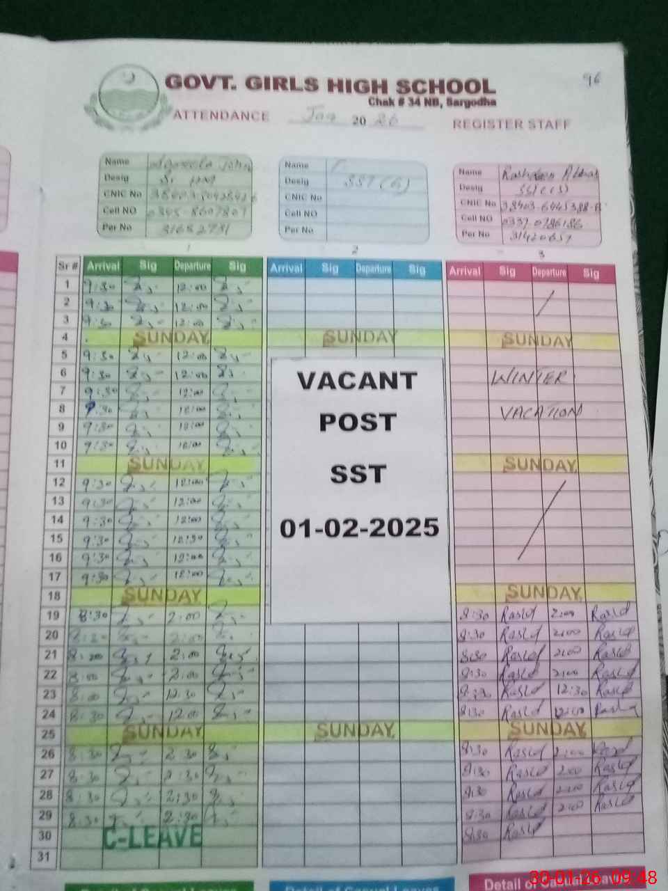 | CNIC | Full Name | Designation | R/C | Absence During Last Calender Month |