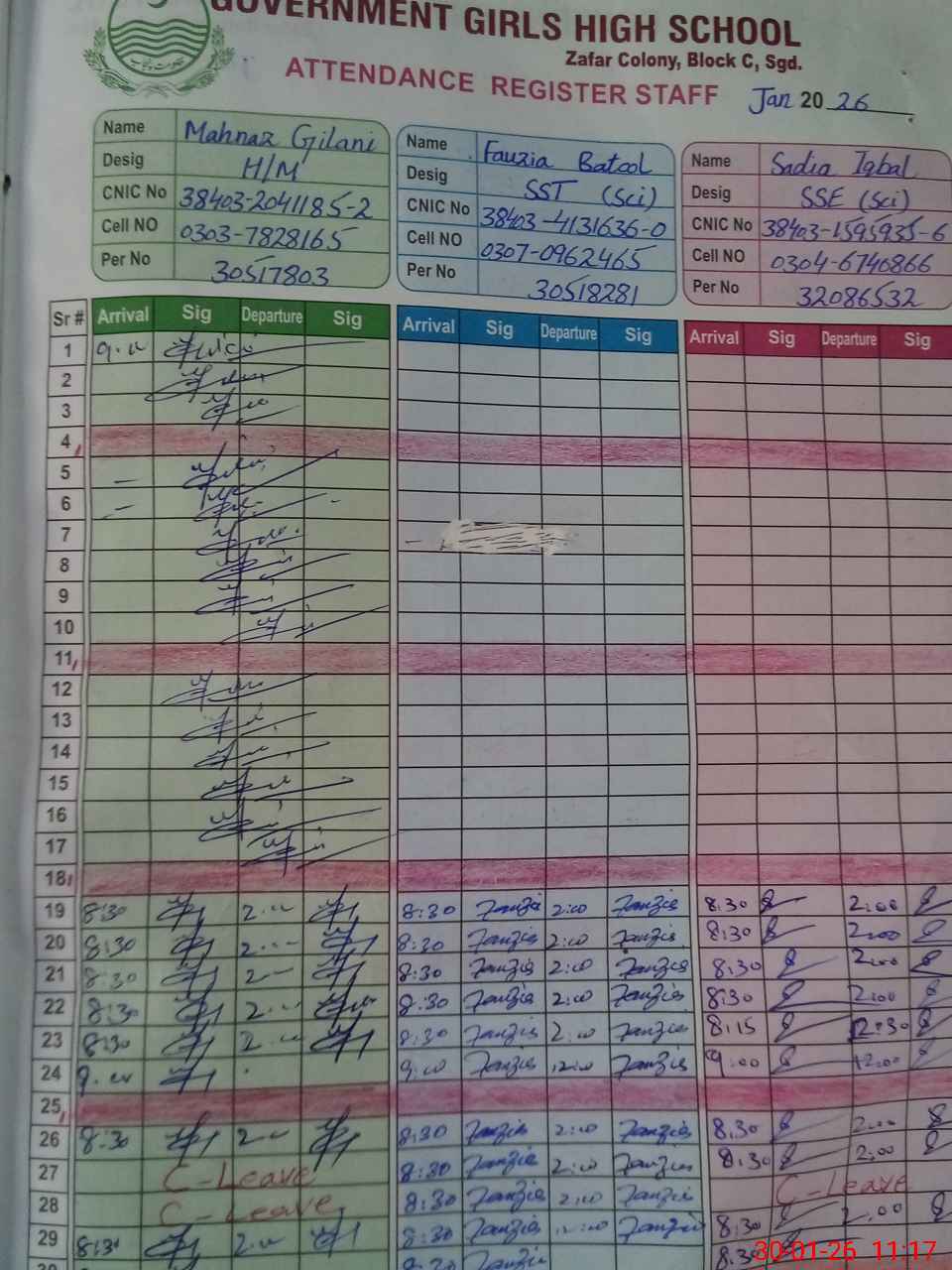 | CNIC | Full Name | Designation | R/C | Absence during last cal. month |