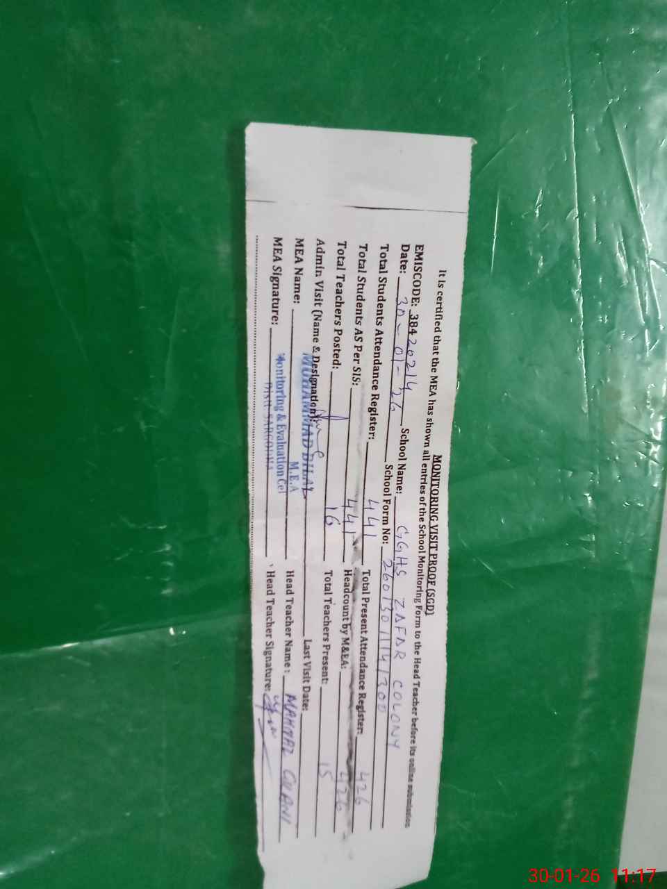 | Attendance Register | Head Teacher | MEA with School | Visit Proof |