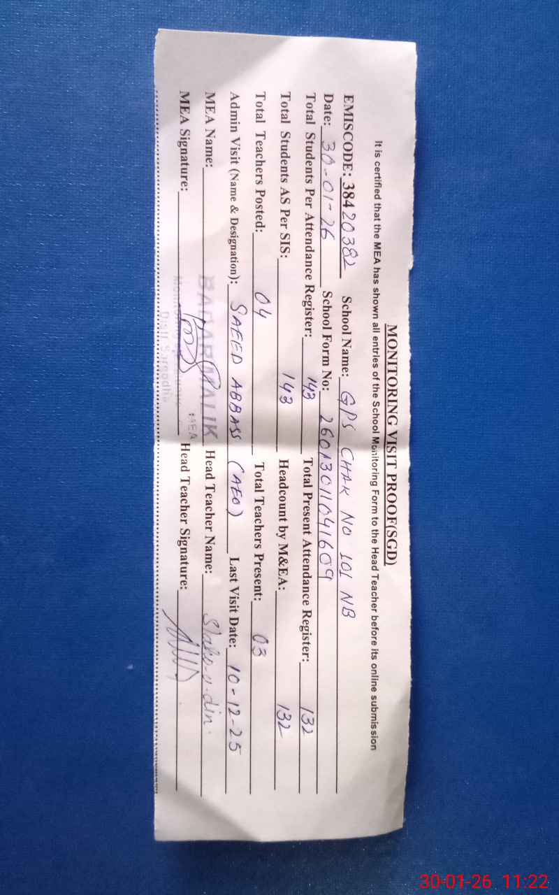 | EMIS Code: 38420382 | Name of School: GPS CHAK NO.101 NB | |||