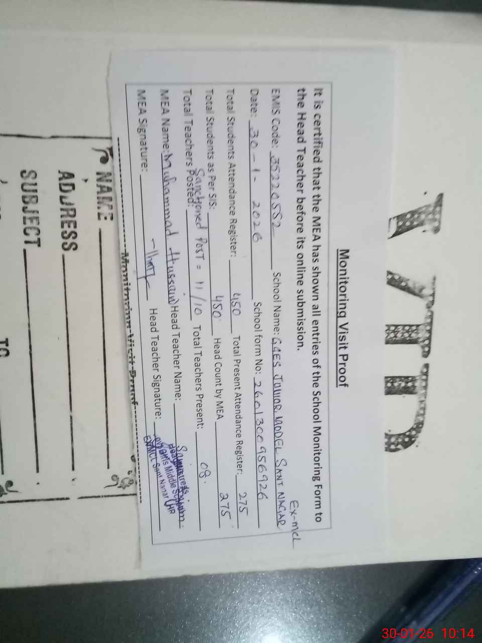 | Certified that this School was Inspected by the Undersigned MEA/DMO Today and the Information Stated Above is as Per Record. | |||||