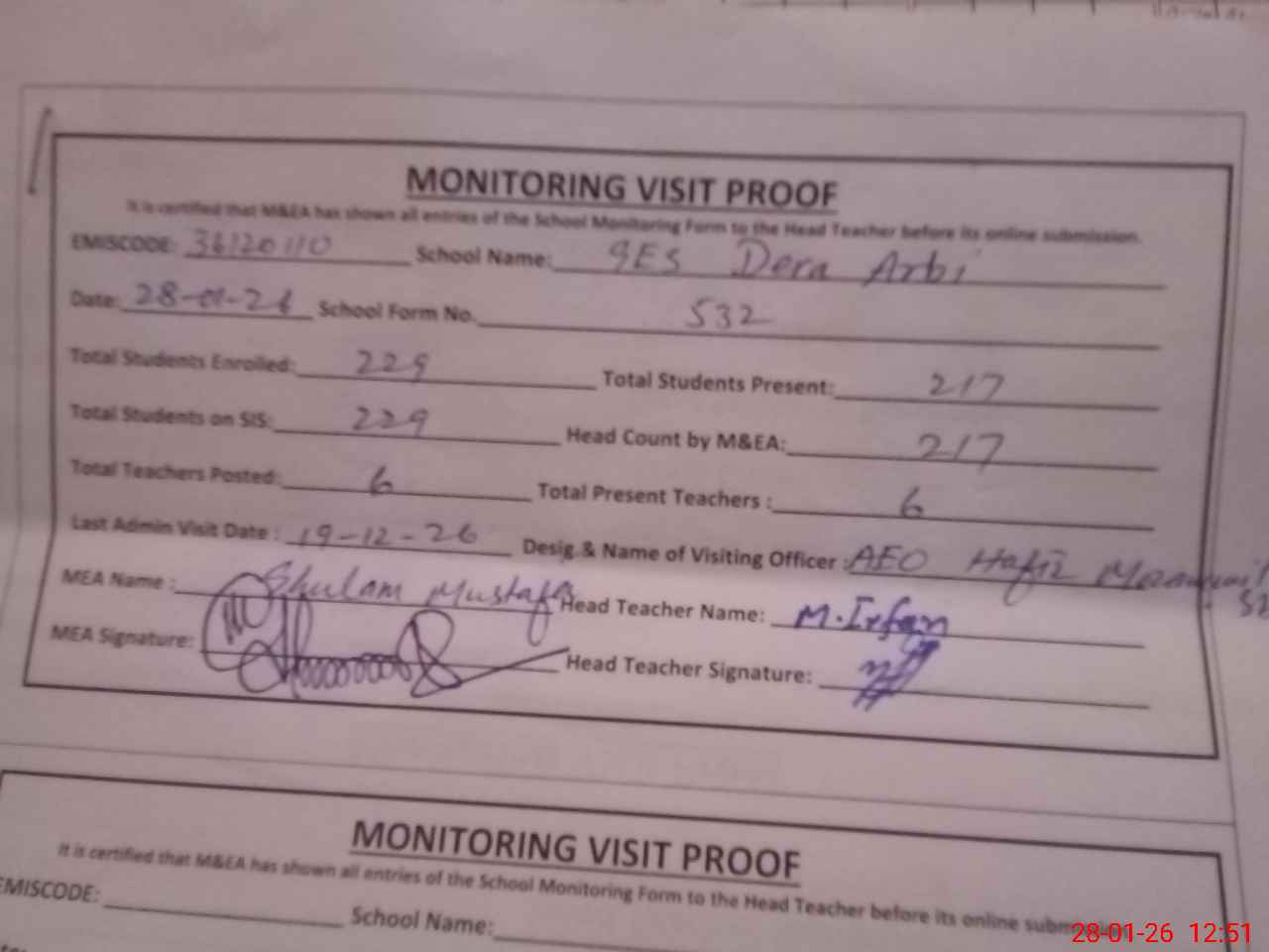 | Attendance Register | Head Teacher | MEA with School | Visit Proof |