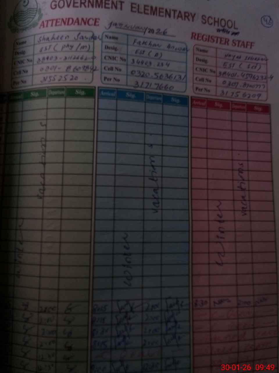| CNIC | Full Name | Designation | R/C | Absence during last cal. month |
