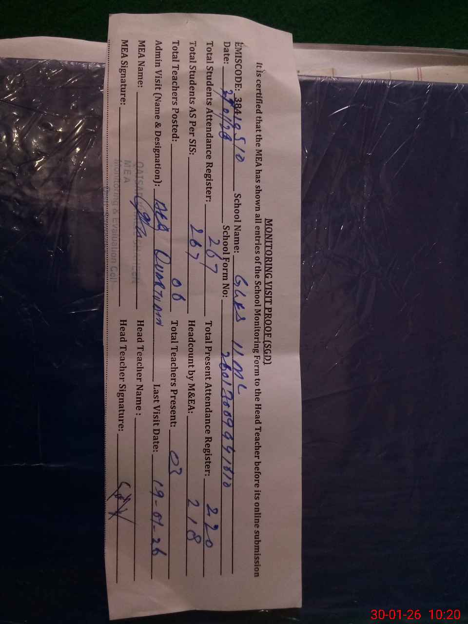 | Attendance Register | Head Teacher | MEA with School | Visit Proof |