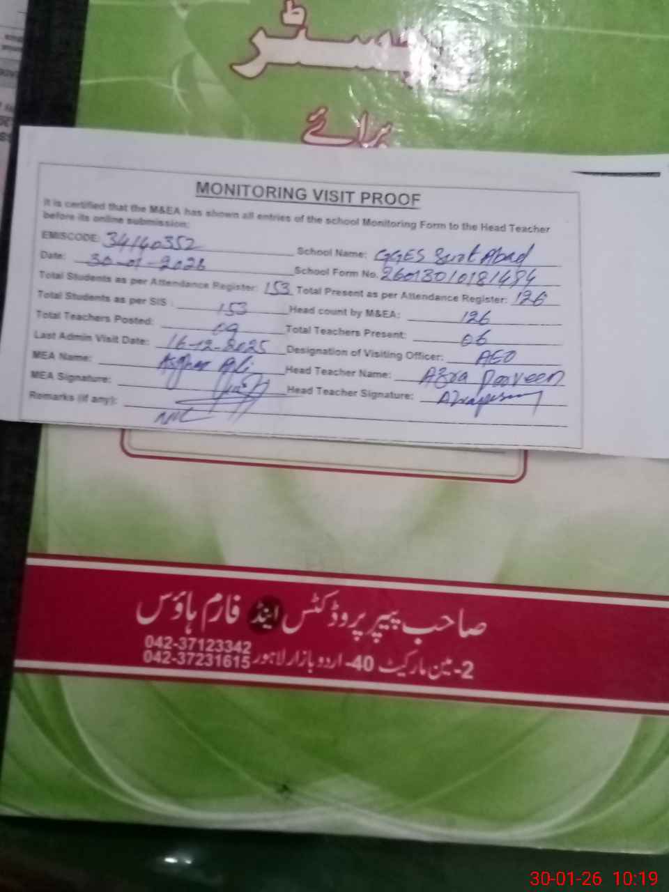 | Attendance Register | Head Teacher | MEA with School | Visit Proof |