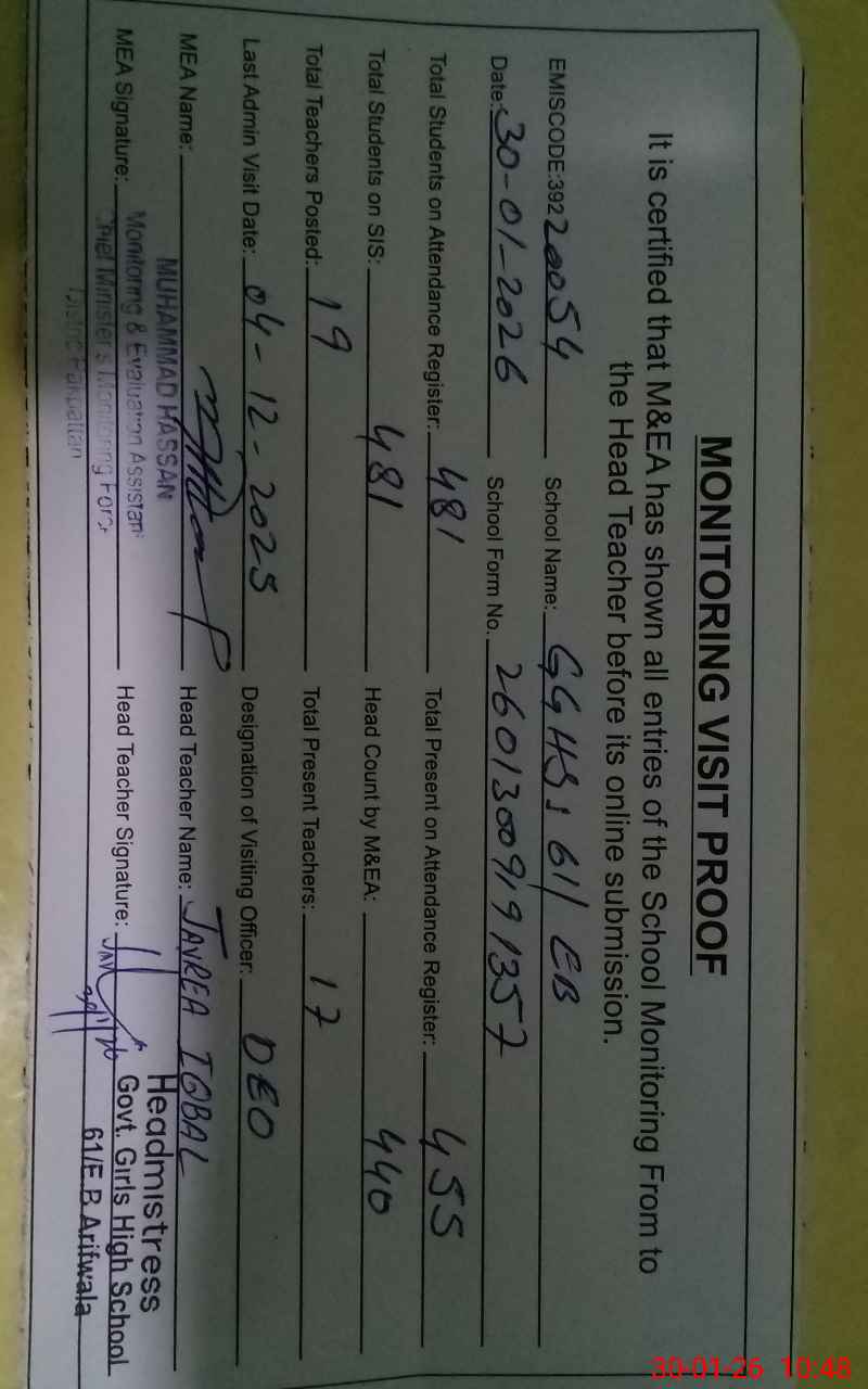 | EMIS Code: 39220054 | Name of School: GGHS 61 EB | |||