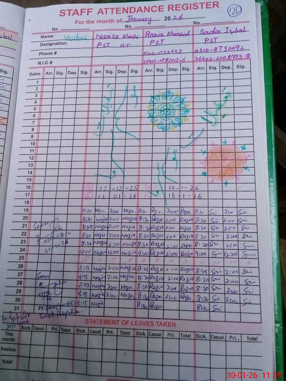 | Name: Na**** Kh**** Designation: (School Headmaster's/Headmistress's) PST Phone/Cell Number: 03**** |