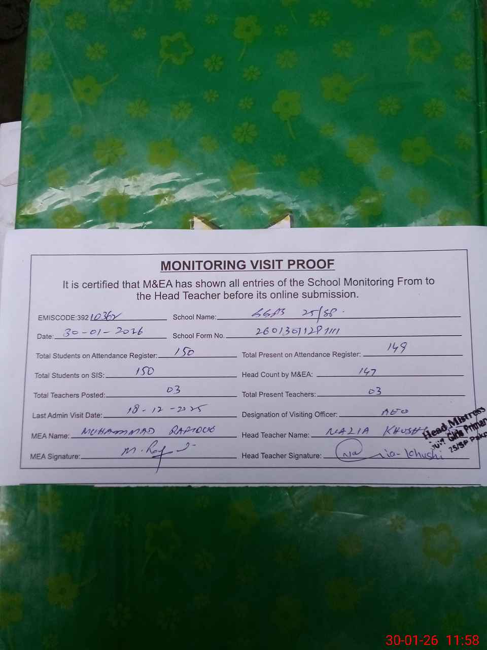 | Attendance Register | Head Teacher | MEA with School | Visit Proof |