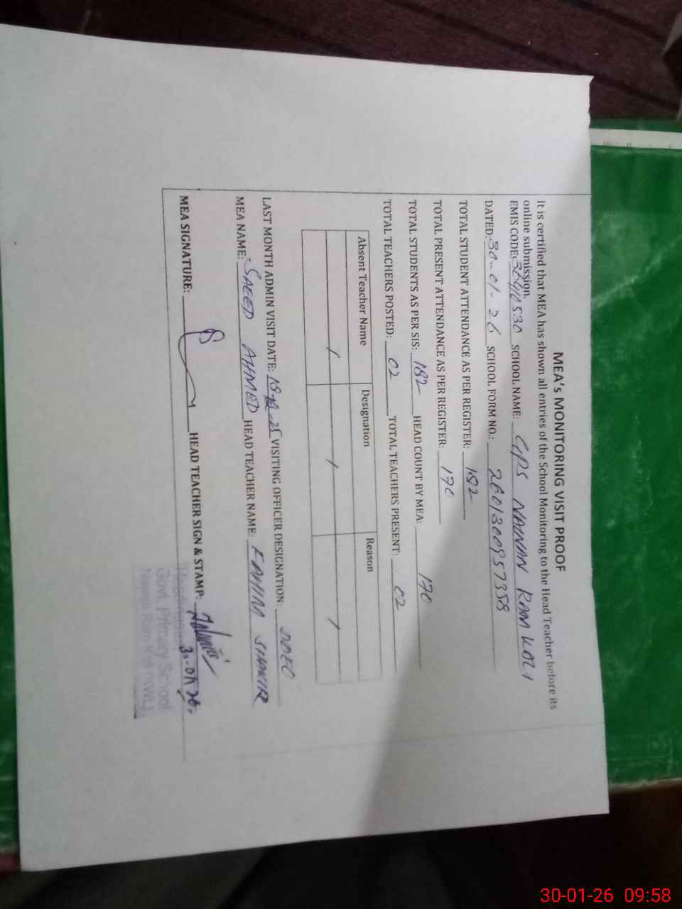 | Attendance Register | Head Teacher | MEA with School | Visit Proof |