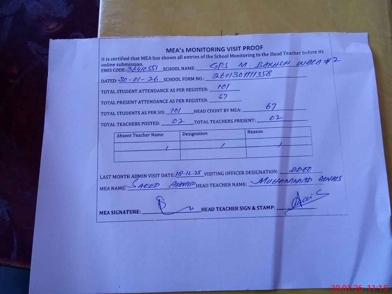 | Attendance Register | Head Teacher | MEA with School | Visit Proof |