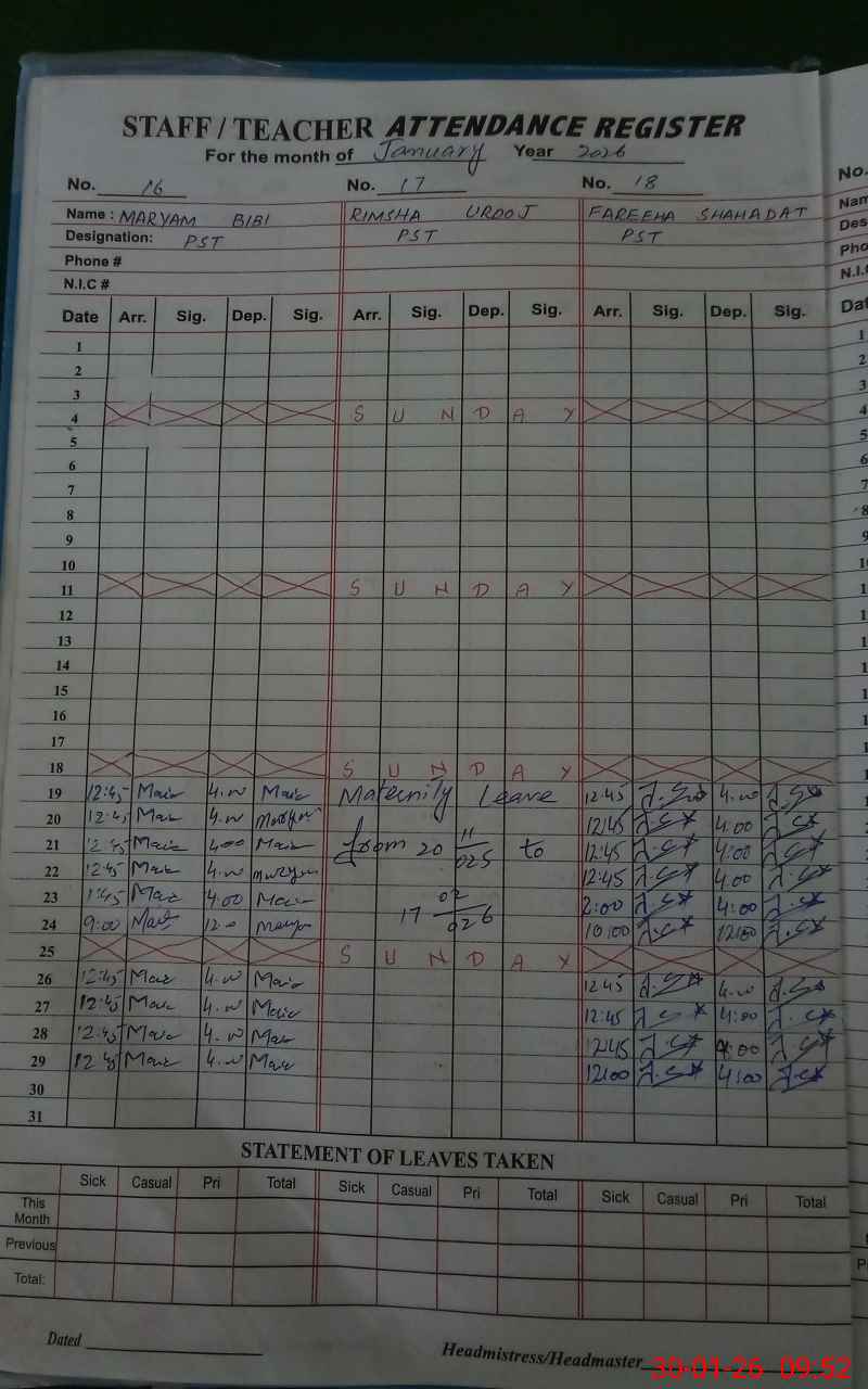 | 34**** | Ri**** Ur**** | PST Science/Maths | Regular | 0 | 0 | 0 | 0 | 0 | 0 | 0 | 0 | 0 | Maternity |