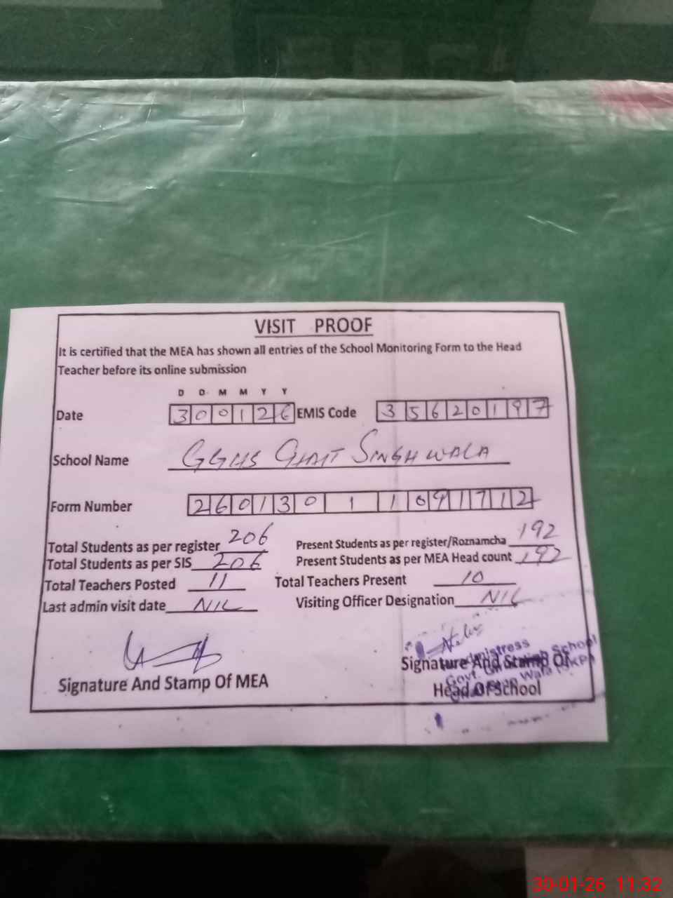 | Attendance Register | Head Teacher | MEA with School | Visit Proof |