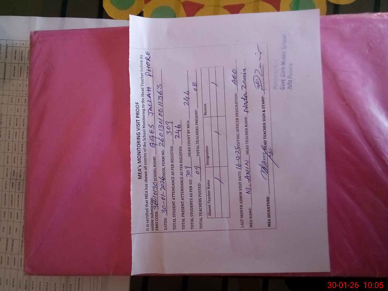 | Attendance Register | Head Teacher | MEA with School | Visit Proof |